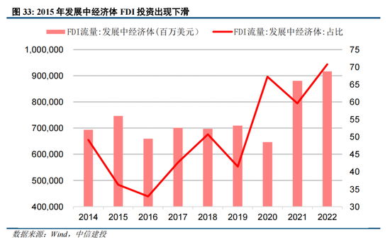 发展中经济体FDI投资占比自2015年便开始下滑,2016年探底,2017年虽然小幅回升但仍在偏低水平。