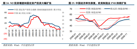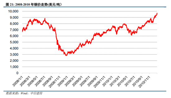 (二)2008-2010:V型大反弹,铜价先抑后扬。2008-2010,铜价先抑制后扬。“抑”的原因比较简单,全球金融危机挫伤全球需求;“扬”的触发因素也简单,资金流动性以及中国经济在四万亿之后率先复苏。