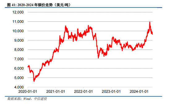 (六)2020年后疫情时代:铜价一波三折,价格中枢上移。2020-2021年,疫情影响下铜价先跌后涨。2022美国货币政策收紧压制铜价表现。2023年,电网建设投资和家电行业景气高增,新能源边际贡献走高,新增铜需求对价格形成支撑。