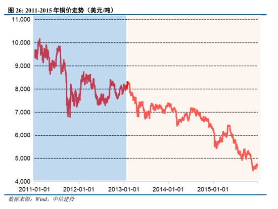 2011-2015年,LME铜价年度涨跌幅分别为,-17%、+5%、-10%,-11%,-27%。