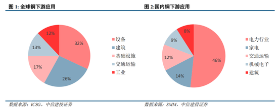 根据ICSG数据统计,全球铜在设备、建筑、基础设施、交通和工业中的消费占比分别为32%、26%、17%、13%和12%。