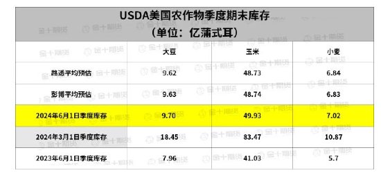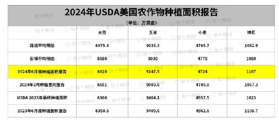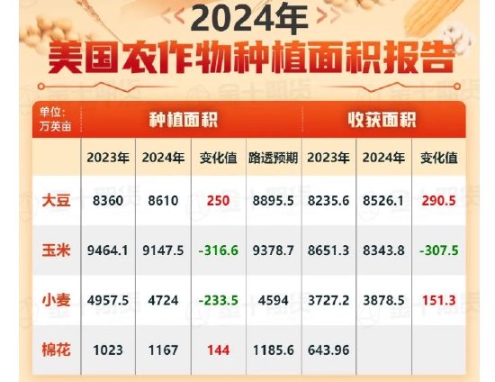 北京时间2024年6月29日凌晨0点,美国农业部公布种植面积报告和季度库存报告,数据如下: