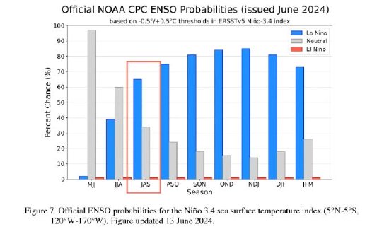 据金十期货APP查询官方资料,美国国家气象局下属气候预报中心(CPC)6月13日表示,现在注意拉尼娜现象,因为拉尼娜现象更容易在7—9月形成(65%的可能性),并持续到2024—2025年北半球冬季。2024年7月至9月,美国大部分地区的气温将高干正常水平。