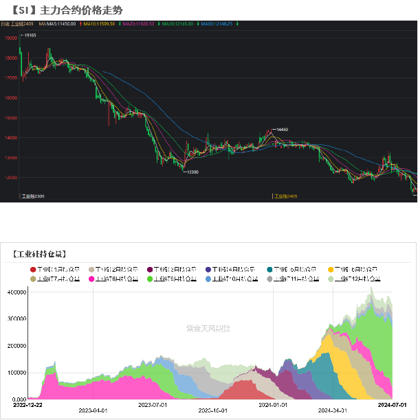上周总结:上周盘面再度回归基本面交易,盘面增仓下行,现货也再度走跌。供应端,周产量绝对值持续突破历史最高位,云南尚有复产空间、四川加速生产、新疆输出高位稳定,后期复产或继续推进,但同时需关注低价下主产区生产调整计划。需求端,多晶硅生产企业检修进行中,硅料产量环比已有减少,硅料价格于底部企稳,但库存压力仍然显著,需关注硅料厂的进一步检修减产情况。有机硅企业近期开工率稳定波动,库存保持在可控的位置,整体的生产销售相对稳定。硅铝合金企业开工率持平,下游也以刚需采购为主,合金厂开工率上行驱动有限。整体来看,近期基本面边际变动走在市场预期内,尚未有超预期因素出现,价格也表现为回落于底部区间震荡,符合我们此前“硅价有依托基本面酝酿新一轮跌势的迹象,价格下行可以说是顺势而为”的观点,后续来看,终端需求暂时没有走出高增速的迹象,而工业硅直接下游在维持自身产销平衡的阶段,也无法给到工业硅充分采购需求,工业硅过剩矛盾压力更甚,但从生产成本考虑,下行空间也可预见。近期关注硅厂生产调整情况,以及三中全会召开下可能存在的利多。