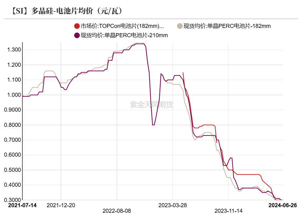 硅片仍处于降产去库阶段,库存较前月有所缓解,但整体仍有10GW以上,若电池采购需求仍难提振,后续硅片或继续降产去库。上周P型-182硅片价格环比持平于1.25元/片、P型-210硅片价格环比持平于1.70元/片,N型-182硅片价格环比持平于1.10元/片,N型-210硅片价格环比持平于1.70元/片。