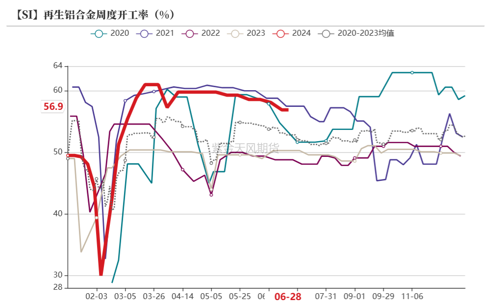 铝合金开工依然维持在相对稳定的状态,下游采购增量有限,难以支撑合金开工率走高。上周再生铝合金开工率环比持平于56.9%、原生铝合金开工率环比持平于50%。