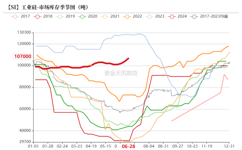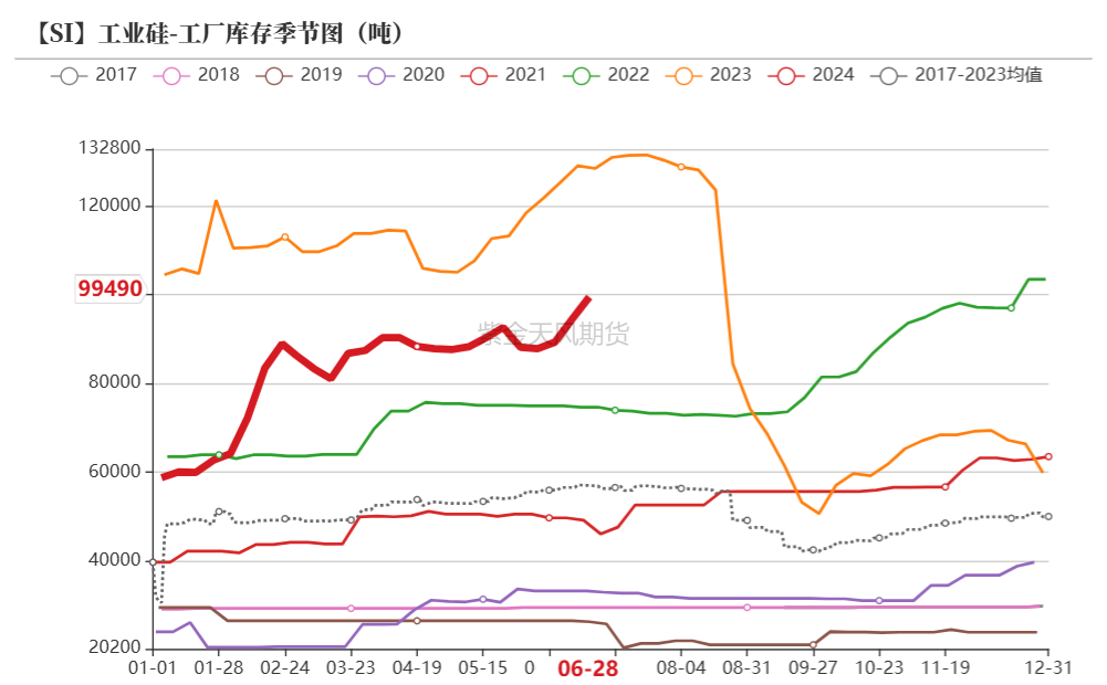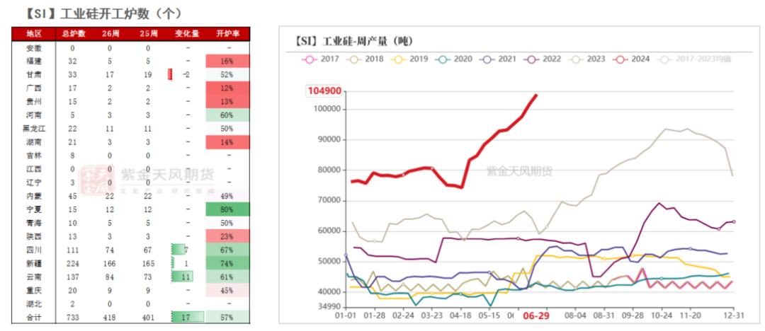周产量绝对值持续突破历史最高位,云南尚有复产空间,四川加速生产,新疆输出高位稳定。后续来看,供应增量或由西南提供,持续的增量压力下,北方产区部分高成本硅厂或有提前停产预期。