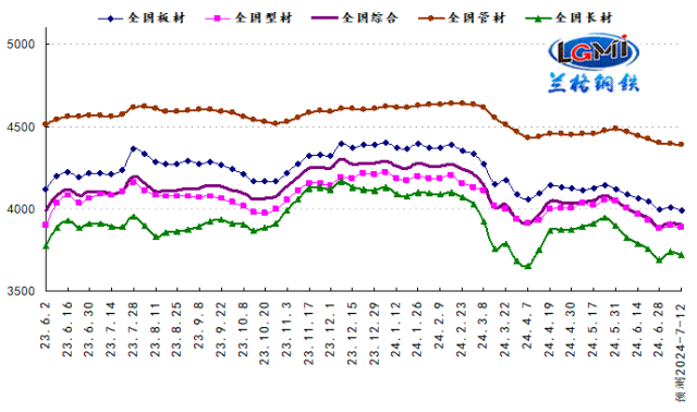 2024年第27周(2024.7.1-7.5)兰格钢铁全国绝对价格指数为3919元,较上周上升0.7%,较去年同期下降4.6%。其中,兰格钢铁长材绝对价格指数为3739元,较上周上升1.3%,较去年同期下降4.4%;兰格钢铁型材绝对价格指数为3901元,较上周上升0.5%,较去年同期下降4.6%;兰格钢铁板材绝对价格指数为4010元,较上周上升0.3%,较去年同期下降4.9%;兰格钢铁管材绝对价格指数为4397元,较上周下降0.1%,较去年同期下降3.7%。