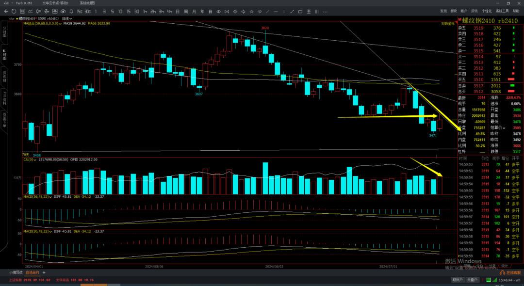 个人认为,虽然今天不算彻底筑底,但是价格涨也涨了,量能也放出来了,空头也跑了那么多,资金短期还是要观望一下的,时间一到两个交易日,走走看看。但因为压力位没破掉,整体还是下跌趋势不改,观点还维持之前的观点不变,螺纹下方依然看3430-3450区间不变,直至趋势发生新的变化。