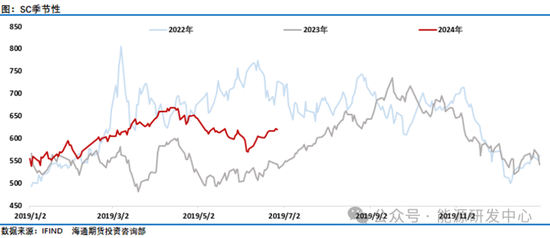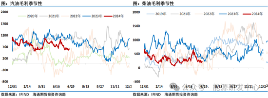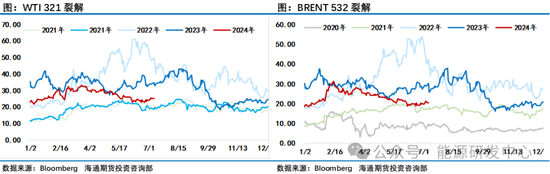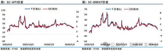 2024年上半年油价重心上移明显,虽然在5月份油价一度大幅回撤,但随着6月份市场预期好转推动油价再次反弹反弹,最终上半年欧美市场油价涨幅10%左右,国内SC原油在人民币汇率下行等因素影响下上半年累积涨幅比欧美市场略高。不过值得注意的是SC的强势更多体现在一季度上周上涨阶段,5月之后随着国内越来越多的迹象显示国内成品油需求远低于年初预期,这开始拖累SC原油的表现,SC开始明显弱于欧美市场,跨区价差走弱3美元左右,从这一点可以看出SC运行越来越成熟,越来越能客观反映中国市场供需状况。总体来看今年上半年油价表现强于去年同期,而且油价运行大节奏基本一致,都是春季走出反弹行情,并在4月份出现高点,之后5月有一轮明显回调,在6月重新止跌回暖。