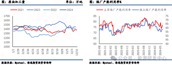 下沉至原油市场,中国石油需求的增长与国内生产总值的增长密切相关。在国内内需较弱的背景下,我们观察到主营炼厂开工率处于平均水平,但独立炼厂的开工率偏低,导致原油加工量在上半年同比下滑。主要由于地炼对利润的敏感度更高,在低利润的背景下开工难有起色。分产品来看,上半年汽油消费同比增长0.21%,基本符合市场预期。然而,随着新能源汽车的增长,汽油后期增量有限。而柴油需求有小幅回落,同比下降3.8%。今年物流领域柴油消费的下滑意味着柴油或进出全领域需求趋弱阶段。