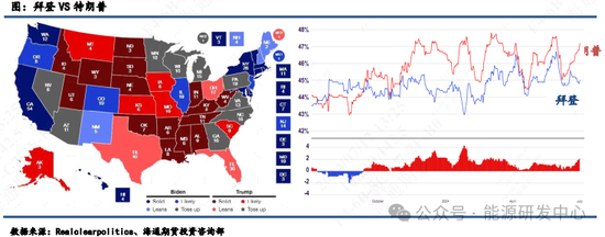 今年是美国大选年,下半年随着总统大选的辩论开启,对油价带来的影响也会递增。目前来看,拜登与特朗普政府民调支持率较为接近,但特朗普在重要的摇摆州中的支持率具有领先优势。双方对原油市场的政策有一定分歧:特朗普政府倾向于回归传统化石能源,包括加快发放石油和天然气的勘探许可,增产传统能源;而拜登政府倾向于发展清洁能源和削减碳排放,以推动2035年实现无碳化电力为目标。由于加快石油和天然气的勘探许可发放或进一步使美国石油产量增加,特朗普的政策主张下油价表现可能相对偏弱,拜登政府偏中性,预计变化不大。
