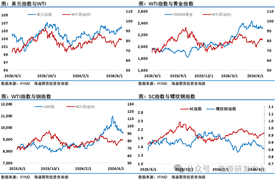 2024年美联储降息不断被一次次后移,这也让美元强势表现得以延续,不过对于大宗商品来讲,美国经济的强劲表现及降息预期对价格运行还是影响明显。2024年上半年一个比较有意思的现象是,油价与美元走势节奏接近一致,这在历史上通常负相关的运行表现出明显的差异,这样的走势也意味着原油市场正在迎来新阶段。另外原油与黄金、铜、钢材的走势出现明显的背离,事实上这种情况在去年下半年也出现过。这种不同资产之间的背离走势给资金带来了非常好的资产配置机会,6月份在原油市场供需层面没有强势复苏的背景,资金依然借对三季度旺季预期大幅推涨油价的行为,除了一些客观因素之外,从资产配置视角有很大可能是在大宗商品缺乏做的对象阶段,原油成为了资金多配标的,从持仓数据可以看出资金确实也在油价反弹阶段做出了积极增持原油多单的行为,这种从大类资产配置的视角的资金行为在一定程度上也放大了油价的涨势。