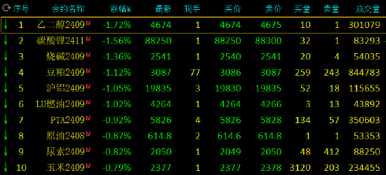 早盘收盘,国内期货主力合约跌多涨少。集运指数涨超3%,棕榈油、棉花涨近1%;跌幅方面,乙二醇、碳酸锂、烧碱、豆粕、低硫燃料油、沪铝跌超1%。