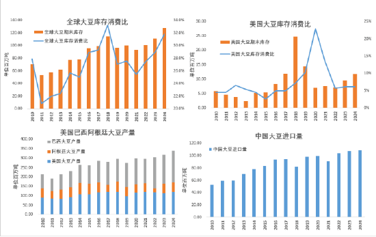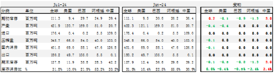 旧作方面的调整,中国2023/24年度大豆进口量上调300万吨至1.08亿吨,不过压榨量未做调整,因此使得中国24/25年度的期初库存顺势增加。阿根廷2023/24年度大豆产量下调50万吨至4950万吨。巴西产量未做调整,仍然为1.53亿吨。