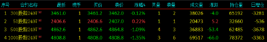 2024年7月15日,股指期货涨跌不一,沪深300股指期货(IF)主力合约跌0.12%,上证50股指期货(IH)主力合约涨0.22%,中证500股指期货(IC)主力合约跌1.09%,中证1000股指期货(IM)主力合约跌1.35%。