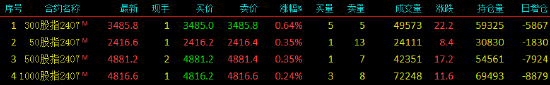 2024年7月16日,股指期货窄幅震荡,沪深300股指期货(IF)主力合约涨0.64%,上证50股指期货(IH)主力合约涨0.35%,中证500股指期货(IC)主力合约涨0.36%,中证1000股指期货(IM)主力合约涨0.24%。