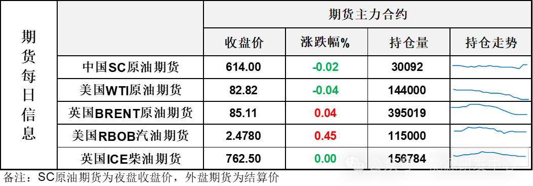 【1】WTI主力原油期货收跌0.03美元,跌幅0.04%,报82.82美元/桶;布伦特主力原油期货收涨0.03美元,涨幅0.04%,报85.11美元/桶;INE原油期货收跌0.02%,报614元。