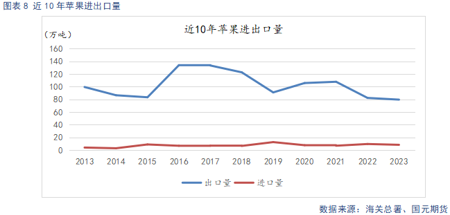据海关总署数据显示,24年6月,我国苹果累计出口量为6.02万吨,较上月环比下降0.8%,较去年同比增幅88.7%。主要是适合出口的货源价格维持低位,成本优势明显。在果季进入后期,剩余库存不大的情况下,6月依然能维持较大规模出口量,同比更是大幅增长。不过我国每年出口量占总产能的比例在2-3%左右,鲜果消费主要还是依靠内需,在内需低迷的大背景下,出口亮眼能缓解一部分需求压力,但难以扭转整体需求不足的状况。