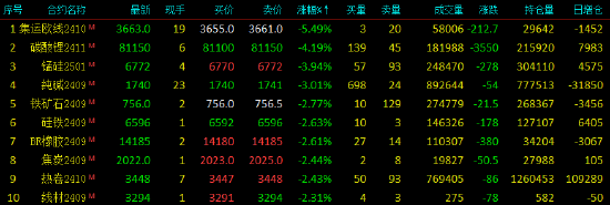 2024年7月30日,期市收盘,国内期货主力合约多数下跌,集运欧线跌超5%,碳酸锂跌超4%,锰硅跌近4%,纯碱跌超3%,铁矿、硅铁跌近3%,BR橡胶、焦炭、焦煤、热卷跌超2%。涨幅方面,尿素涨超1%。