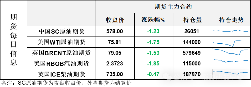 【1】WTI主力原油期货收跌1.35美元,跌幅1.75%,报75.81美元/桶;布伦特主力原油期货收跌1.23美元,跌幅1.53%,报79.05美元/桶;INE原油期货收跌1.23%,报578元。