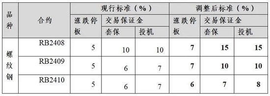 公告显示,自2024年7月31日(周三)收盘结算时起,螺纹钢RB2408合约的涨跌停板幅度调整为7%,套保交易保证金比例为15%,投机交易保证金比例为15%;螺纹钢RB2409合约的涨跌停板幅度调整为7%,套保交易保证金比例为10%,投机交易保证金比例为10%;螺纹钢RB2410合约的涨跌停板幅度调整为6%,套保交易保证金比例调整为7%,投机交易保证金比例调整为8%。