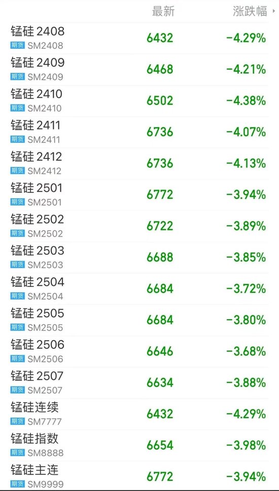 昨日,黑色系商品午后跌势加剧,锰硅在延续了近一个月的疲态后再度走低,盘中跌幅超过4%。截至收盘,锰硅期货全线下跌,主力合约下跌3.94%,报收6772元/吨。