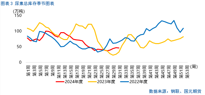 国内农业需求零散补货,整体需求偏淡;工业方面,秋季复合肥生产高峰期到来,对尿素需求存在少许提振;出口方面,7月下旬公布的6月尿素出口量达到7.42万吨,环比增加114.51%,市场存在对出口需求上升的期待。从整体销售来看,尿素价格跌至低位后,下游跟进补货,随后尿素现货上涨、销售好转,库存去化加速。截至2024年8月1日,中国尿素企业总库存量31.87万吨,较上周减少2.83万吨,环比减少8.16%;尿素港口样本库存量14.6万吨,环比增加2.3万吨,环比涨幅18.70%。