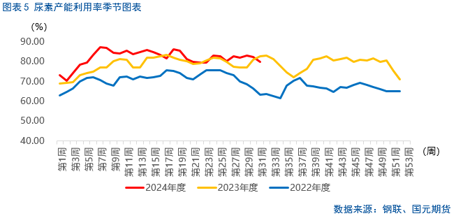 供应损失使得基本面压力缓解,本周供应大概率下滑。上周部分企业检修,大颗粒尿素供应下滑明显。根据隆众统计,七台河勃盛、云南大为制氨、中煤鄂尔多斯能源的装置于7月26日之后检修,最早将于8月27日恢复,整个检修期间,据统计,尿素面临产能损失大约30万吨/年。截至7月31日,中国尿素产能利用率79.80%,环比跌2.69%;小中颗粒84.18%,环比跌0.37%;大颗粒60.64%,环比跌12.86%。