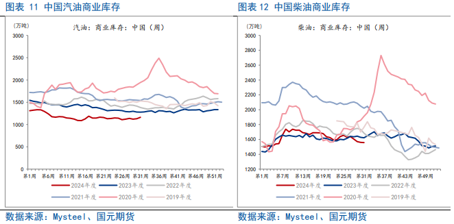 我国7月汽油柴油总库存下降,2720万吨,需求一般,但炼油厂供应处于低位。我国7月汽油库存明显低于2023年同期水平,而我国柴油库存在7月出现小幅去库趋势后,也低于2023年同期水平。