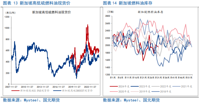 OPEC+的减产导致亚洲地区炼油厂原料短缺,6月单月中国减少了燃料油的进口,进口量低于俄罗斯禁令前的水平,且中国燃料油表观需求量上半年持续下降,高硫燃料油8月大概率仍以偏弱运行为主。