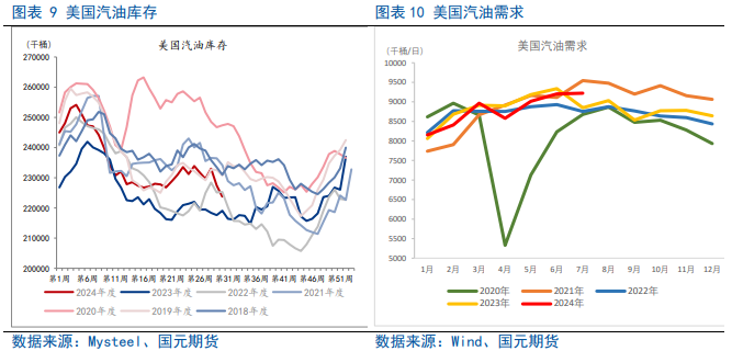 7月初,美国汽油消费达到940万桶/日的年内高点,从4周平均水平来看,已经超过2023年同期的消费水平,但仍较2019年同时期的高点有近30万桶/日的差距。美国独立日假期结束后,汽油消费阶段性回落,但随后再度反弹,重新回到 940万桶/日上方,基本符合市场预期,旺季需求有所兑现。