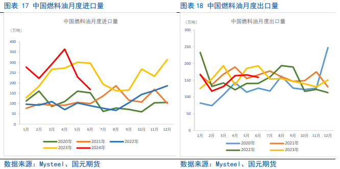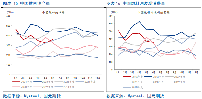 国家统计局数据显示,2024年6月中国燃料油产量为361.4万吨,环比增长11.75%,同比下降19.20%。2024年1-6月中国燃料油产量为2251.3万吨,同比下跌17.38%;1-6月表观消费量同比下降9.27%至2838.64万吨。