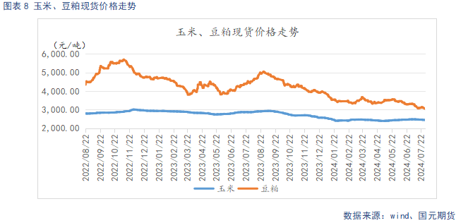 截止7月30日,玉米现货价格2443.69元/吨,较上月同期环比下跌36.7元/吨,豆粕现货价3057.43元/吨,较上月同期下跌260.57元/吨。7月蛋鸡养殖成本3.6元/斤,较上月环比下降0.05元/斤,饲料原料弱势运行,养殖成本环比下降。玉米新季生长情况良好,惜售情绪降温,产区价格偏弱运行。饲料企业随用随采,并且小麦丰产,替代性仍存,需求整体偏弱。供强需弱下,玉米预计将维持低位偏弱震荡。美豆存丰产预期。7-8月国内进口大豆到港仍处于年内高峰,豆粕供应端以宽松为主。下游来看,水产养殖高峰期将过,猪肉消费淡季限制后续饲料需求,豆粕处于供强需弱格局。整体来看,饲料原料价格预计维持低位,在成本端上对蛋价的支撑力度有限。