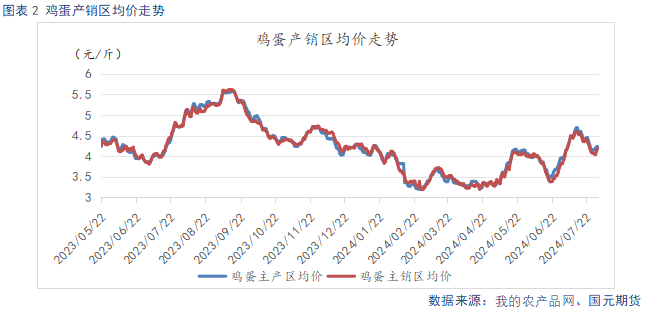 7月上旬,库存低位下,下游补货积极性较高,市场在旺季将临预期下,看涨情绪升温,主产区均价最高至4.69元/斤的全年高价。至7月下旬,高温高湿环境下,储存难度较大,贸易出货积极,蛋价承压回落。主力盘面受限于供给宽松影响,短暂上行后迅速回落,整体维持区间宽幅震荡。