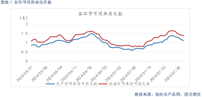 截止7月31日,生产环节可用库存天数为1.15天,较上月同期增加0.41。流通环境可用库存天数为1.4天,较上月同期增加0.56天。6月蛋价处于低位,终端需求转好,下游加工企业也逢低补货,市场流通节奏较快,库存维持低位。7月蛋价走强后,终端跟进不足,需求转弱,价格持续回落。加之高温高湿天气下,鸡蛋储存难度较大,市场流通节奏放缓后,贸易商拿货心理偏谨慎,各环节库存天数环比增长。