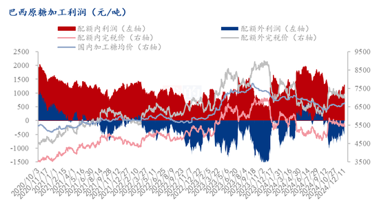 从图上可以看出进口数量稳固增长,在2025的预期中更是达到了230万吨。国内食糖产量维持在1000万吨左右,糖浆已经占比超过10%,突然按下暂停键对市场影响巨大,是可以改变国内供需格局的政策。缺少一个有效糖源,国内加工糖厂就必须承当更多的任务,然原糖价格持续维持高位,国内进口加工利润为负数。12月11日,我国以进口巴西原糖为原料生产的白糖其销售利润约为1255元/吨(关税配额内,15%关税)或-282元/吨(关税配额外,50%关税);我国以进口泰国原糖为原料生产的白糖其销售利润约791元/吨(关税配额内,15%关税)或-887元/吨(关税配额外,50%关税)。这必定会推高国内现货价格产生支撑。