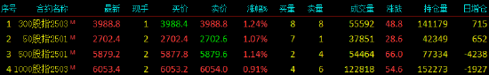 2024年12月24日,股指期货全线上涨,沪深300股指期货(IF)主力合约涨1.24%,上证50股指期货(IH)主力合约涨1.07%,中证500股指期货(IC)主力合约涨1.14%,中证1000股指期货(IM)主力合约涨0.91%。