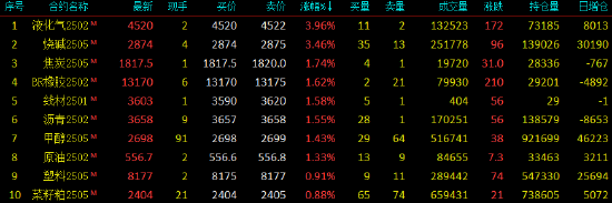 2024年12月31日,早盘收盘,国内期货主力合约有涨有跌。液化石油气(LPG)、烧碱涨超3%,焦炭丁二烯橡胶沥青甲醇、SC原油涨超1%。跌幅方面,集运欧线跌超2%,工业硅棕榈油跌超1%。