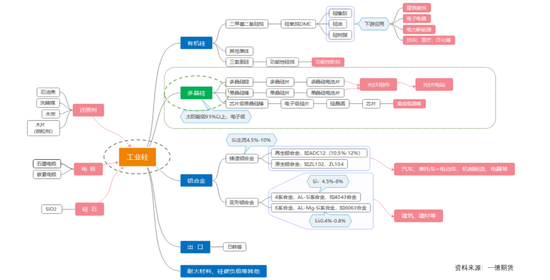 工业硅和多晶硅处于硅产业链的不同位置,两者是上下游关系,工业硅处于上游,是硅基新材料产业链的基础原材料,多晶硅相对处于中游,是光伏产业链最核心的原材料,两者在生产、用途、产业现状等多方面存在一些异同。