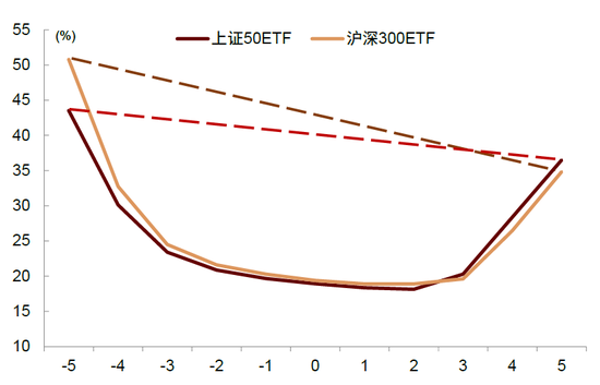 VIX的信息较为单一,而隐含波动率则提供了一个信息更丰富的波动率视角。因为挂钩每一指数的期权每一天都会有数量丰富的合约,分布在两个维度上:到期期限和价值深度。而每一个合约都可以根据其市场价格计算出隐含波动率。因此每一个指数挂钩的期权产品的隐含波动率都可以形成一个二维曲面,一般我们称之为隐含波动率曲面。当我们固定到期期限做一个价值深度维度的切片,大概率会得到“波动率微笑”。通过对波动率曲面或微笑上的虚值看跌或者看涨期权的隐含波动率采样并计算相应比值,我们可以得到特定价值深度的看跌或是看涨期权的相对热度,进而推断期权市场的情绪如何。由于期权合约的到期期限会随着时间流逝逐渐变化,因此想要获得稳定到期期限的期权指标,我们需要对期权的隐含波动率曲面做插值处理,取固定到期期限的坐标点才能获得稳定指标序列。