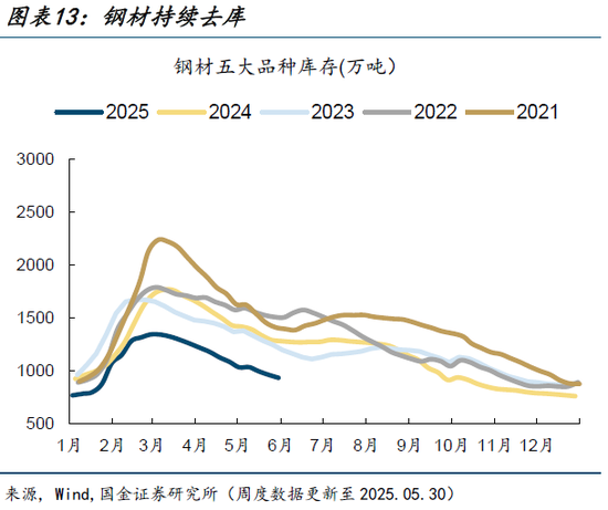 钢材持续去库。5月30日,五大钢材品种库存932.5万吨,较5月23日下降28.0万吨。