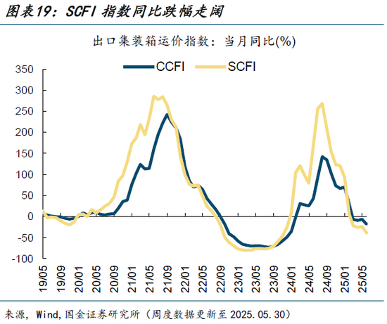 5月以来,CCFI指数同比下跌18.4%(前值下跌6.4%),环比下跌0.3%(前值下跌4.5%);SCFI指数同比下跌38.7%(前值下跌24.1%),环比上涨18.4%(前值上涨1.3%)。