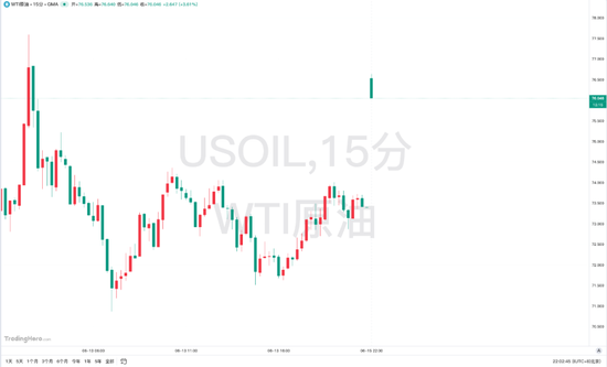 受中东局势升级影响,WTI原油周一开盘涨超6%,报76.13美元/桶,随后涨幅有所收窄。