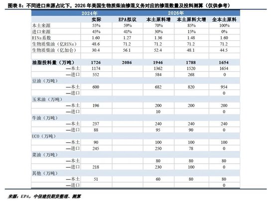 EPA提议将进口生物燃料及进口原料生产的生物燃料RINs生成量削减50%,2024年该比例在生物质柴油中大约为45%左右。因本土原料在RINs生成量上具备优势,预计生物燃料将在2026年后使用更多本土原料,将令该比例面临下降倾向。以2026年为例,我们针对不同比例对生物质柴油的掺混体积进行测算,如下所示: