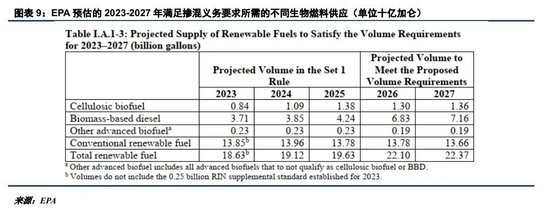 此次EPA发布的公告有较多看点:1、提出对2026-2027年的生物燃料拟议掺混规则;2、免除部分2024及2025年纤维素燃料的掺混要求;3、改革了RFS的基础规则,削减进口生物燃料和进口原料生产的生物燃料的RINs数量,提议取消eRINs在RFS框架下作为生物燃料的合法性。EPA认为此次规则变化有利于增强美国能源独立性,促进本土农业市场发展,也是特朗普政府对不公平的国际贸易的反击。拟议的生物燃料掺混义务量如下所示: