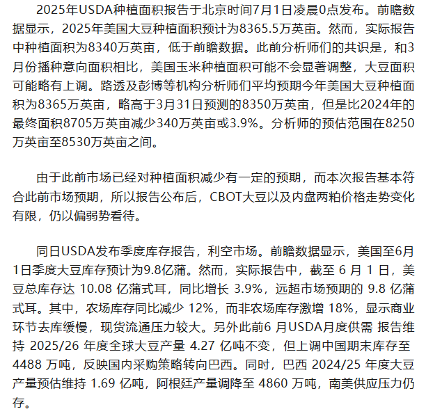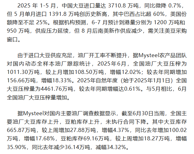 2025 年 6 月下旬以来,豆粕期货市场呈现震荡下行趋势,7月初USDA两报告影响中性偏空,豆粕2509合约整体围绕2930附近震荡整理,本周USDA将发布7月供需平衡报告,目前市场对该报告预期相对中性,国内豆粕供强需弱格局未改,仍缺乏进一步上行空间。