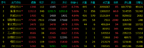 2025年7月25日,早盘开盘,国内期货主力合约涨多跌少,玻璃涨超6%,焦煤涨超5%,纯碱涨超4%,碳酸锂涨近4%,氧化铝、20号胶涨近3%;跌幅方面,铁矿石跌超1%。
