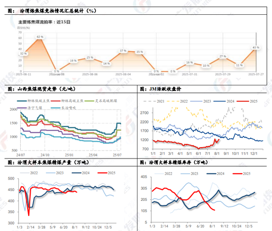 目前焦煤期货合约主要对标山西中硫主焦煤和蒙5精煤,现货价格大涨后仓单成本不断走高,形成期现共振上涨的局面。根据汾渭统计,截至8月11日现货不同煤种焦煤价格分别为:CCI山西中硫主焦S1.3报价1260元/吨、甘其毛都蒙5原煤报价990元/吨,分别较前期低点上涨315元/吨、290元/吨,折算仓单成本为山西中硫(介休)1260元/吨、沙河驿蒙5精煤1145元/吨。可以看到,盘面JM2509合约价格基本平水蒙5精煤仓单成本,由于市场对于后市乐观预期,远月JM2601合约给于一定升水。现货仓单成本抬升,后市继续上涨的看多预期,给予期货价格支撑。