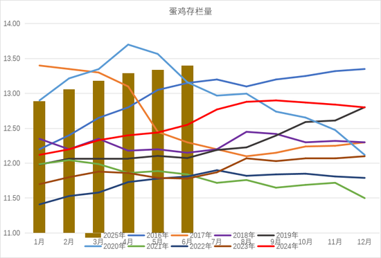 钢联数据显示,2025年7月底在产蛋鸡存栏量约为12.92亿只,环比增加2%,同比增幅7%。卓创数据显示,2025年7月底在产蛋鸡存栏量约为13.56亿只,环比增幅1.2%,同比增幅6.2%。因新增产能较大以及淘鸡节奏偏慢,7月在产蛋鸡存栏量环比继续增加,并在同期较高水平。